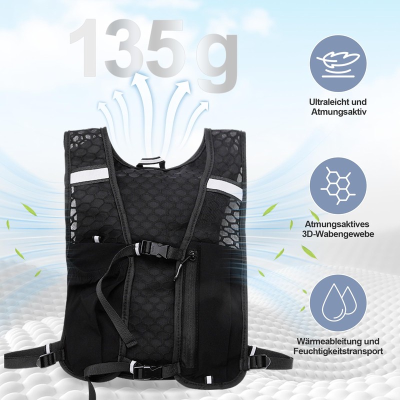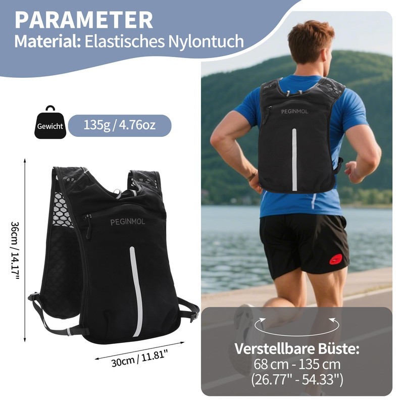 Lightweight, practical and breathable - your perfect companion for outdoor runs. The Peginmol running vest is specially designed for runners, hikers and marathon athletes who value comfort, functionality and safety. At only 135 g, it is extremely light, but offers a perfect fit for any body shape thanks to the adjustable chest and waist belt. 🎯 Main Features: ✔ Multiple practical pockets - 500 ml water bottle holder, side zip pocket for smartphones up to 7 inches and a spacious back compartment for energy bars, keys or money. ✔ ADJUSTABLE & SECURE - Thanks to the adjustable chest strap and waist belt, the vest sits comfortably and does not slip during every run. Reflective elements ensure better visibility at dusk or night. ✔ Breathable & Water-Repellent - The high-tech material effectively wicks sweat away and keeps you dry without overheating. At the same time, it protects against light rain or spray water. ✔ Ultra light and freely movable - At only 135 g, you hardly feel the vest, but it offers enough storage space for all your important items. Ideal for: road running and marathon (no annoying weight), trail running and hiking (stable seat even on uneven paths) night jogging (safe on the go thanks to reflective strips)