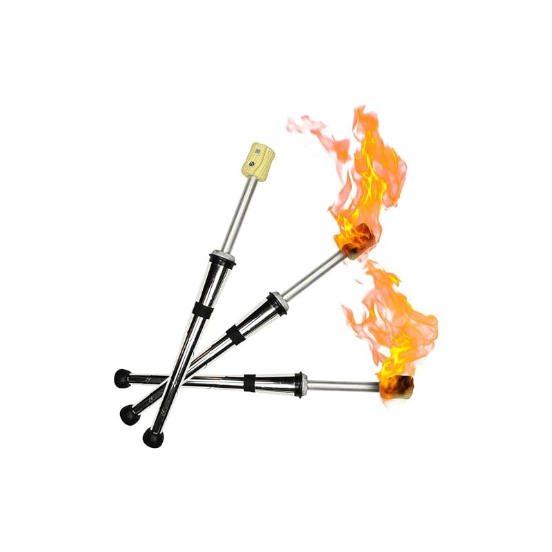 Professional Fire Torch merges juggling with a quality torch assembly, making this a great choice for fire performance! The handle has the build and feel of a premium multi-piece juggling club (complete with deco design and tape), and the torch end is securely mounted at the end of the metal shaft.These torches feature heavy-duty construction all around, for long-lasting fire performance.Specs:Length: 20 in.;Weight: 265 g.