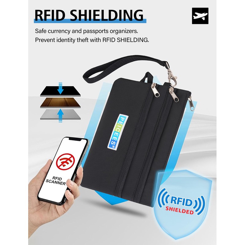 - RFID Blocking: Organize currency, passport and cards with RFID shielded pouches. Anti-RFID (radio frequency identification), protect personal privacy, and prevent bank card theft.