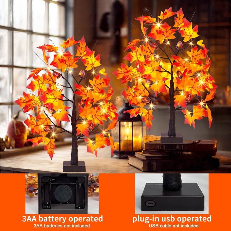 - Autumn Maple Tree:Unbox 2 pcs 22" maple trees with 24 warm LED lights, 6 acorn and lots of maple leaf . Instantly transform any space into a cozy fall wonderland—no extra decor needed!