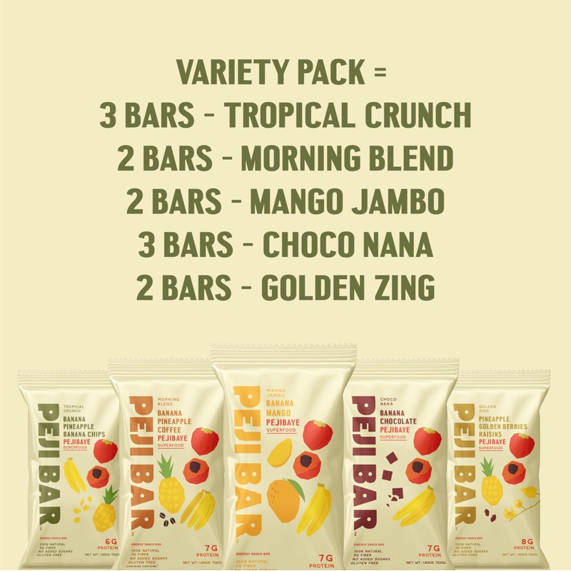 - Complete Flavor Collection: Savor all five delicious PEJI BAR flavors—Morning Blend, Choco Nana, Mango Jambo, Tropical Crunch, and Golden Zing—in one convenient Variety Pack, each made with natural Costa Rican ingredients and powered by pejibaye.