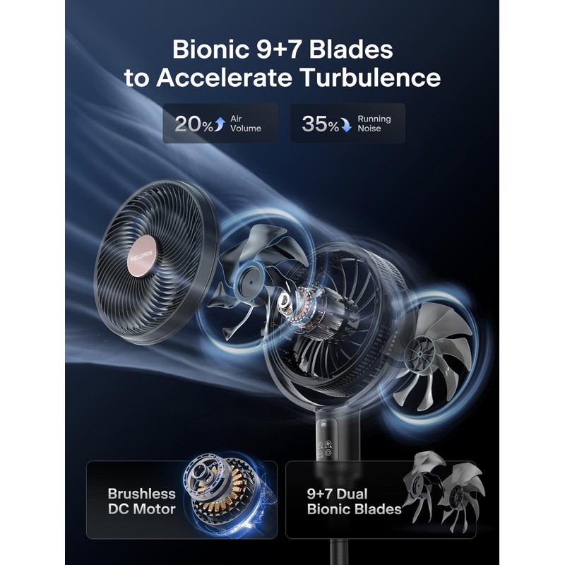 PELONIS Smart Pedestal Fan for Bedroom, Standing Fan, Dual Layed Blades (9+7 Blades), DC Motor, App/Alexa/Google, 150° + 135° Auto OminiFlow, 20dB, 9 Speeds, 23 ft/s, Remote, 9H Timer, Air Circulator