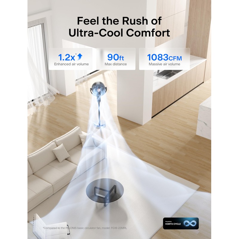 - Gentle Yet Powerful Airflow: Featuring Triple-Acceleration Technology and a 9+7 dual-blade design, this fan delivers a strong yet natural airflow, reaching up to 100ft at 26ft/s with a circulation volume of 850 CFM for efficient cooling.
