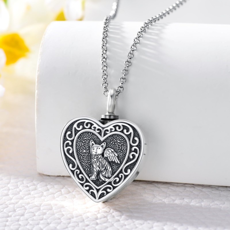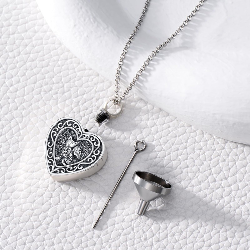 - Cat Urn Necklace for Ashes: The cats we lose will become angels to guard us. This unique cat urn necklace combines a filigree heart-shaped frame with an angel cat in the middle. We hope our cat cremation necklace for ashes can bring you comfort and ease your grief. The cat cremation jewelry is a wonderful memorial gift to remember the loved cats we have lost