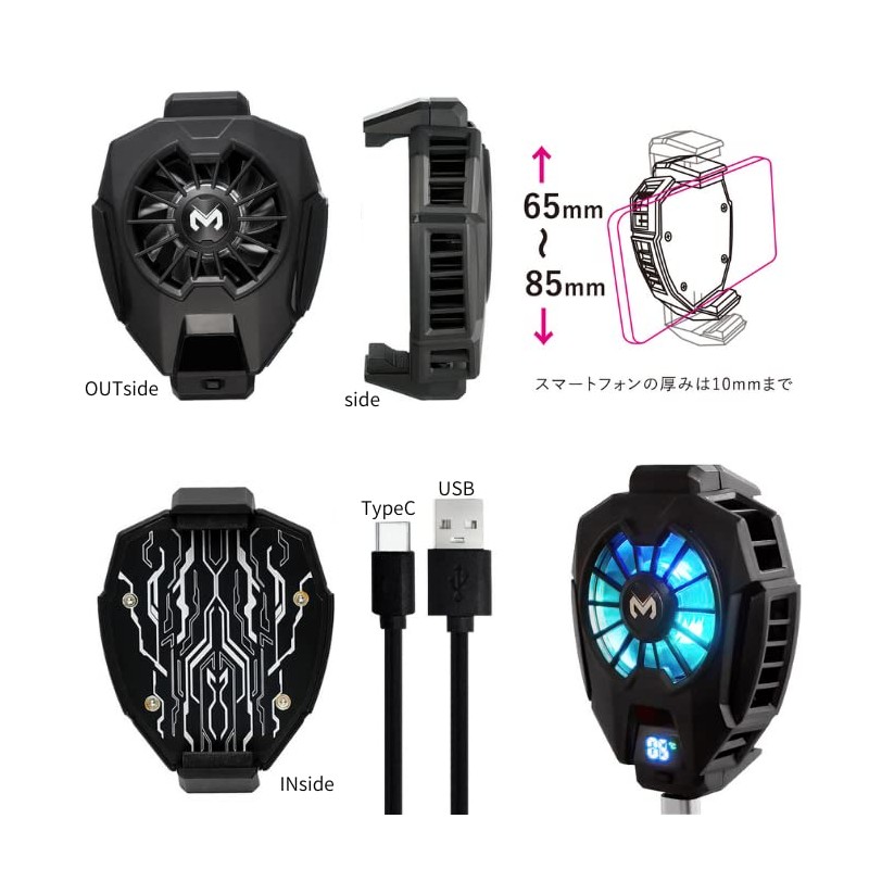 ● This product is a device that clamps to your smartphone and cools the back of your smartphone. Cannot be used for anything other than the intended purposDue to its high cooling capability, the surface of the installation surface will condensate due to temperature difference and humidity. If you have a case that is sensitive to moisture or seal, please remove it before use. ● Smartphones with curved back will reduce footprint and may not be able to provide sufficient cooling performance. ● Be careful not to get condensed water droplets on your smartphone connector. Do not fill the intake or dispose of the fan. This may cause the cooling capacity to decrease or malfunction. ● Design and specifications may be improved without prior notice. ● Regarding the warranty is related to this product, and for any reason we cannot guarantee any other damages including directly or indirectly