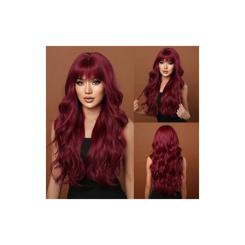 Peluca Rojo Para Mujer Larga Ondulada Flequillos Natural
