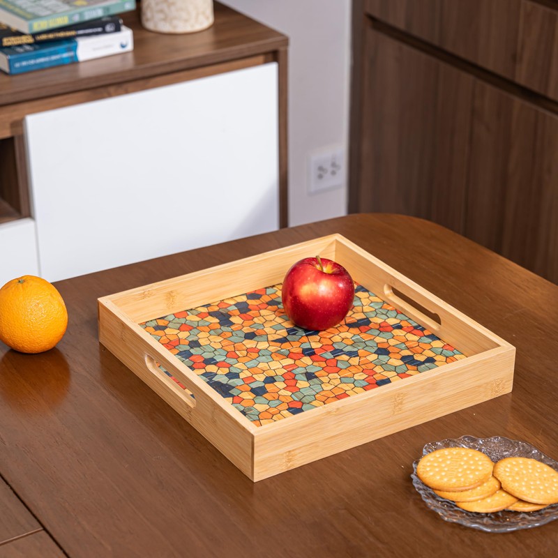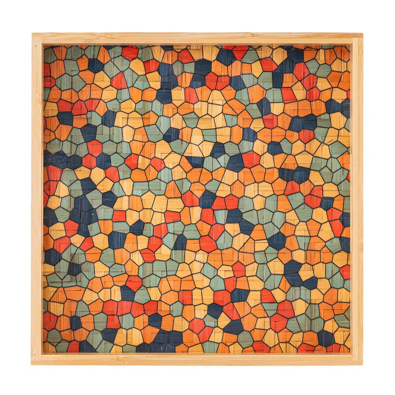 - [DIMENSION & MATERIALS] 12.2”L x 12.2”W. Made of bamboo, the tray edge is bamboo wood, the tray surface is woven by the bambo strips, backed by wood bottom. The mosaic pattern is printed on bamboo surface. The bamboo materials are natural without epoxy coating