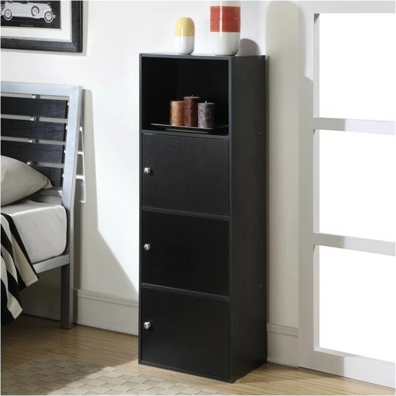 - One open compartment with three closed door compartments that feature chrome knobs and magnetic hinges