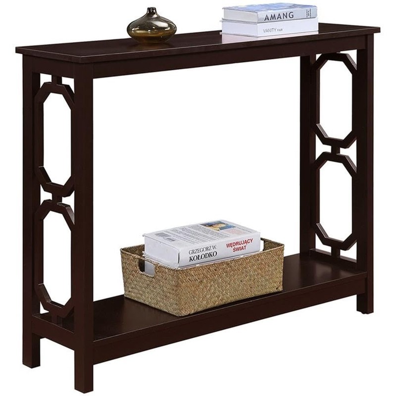 Reinvent your living room with the Pemberly Row Console Table. The simple yet eye-catching design showcases clean lines and beautiful octagon cut-outs on the sides. Featuring a lower shelf that provides usable display space where you can showcase your collectibles. Engineered for durability, this piece will become a staple in your home, as it will last for many years. The neutral tone allows it to blend seamlessly with any decor. Features: - Beautiful Espresso wood finish - Material: MDF - Broad top panel and bottom shelf for additional storage - Easy assembly - Complements any decor - Will provide years of enjoyment - 31.5" H x 39.5" W x 12" D Specifications: - Product Dimensions: 31.5" H x 39.5" W x 12" D - Product Weight: 25 lbs