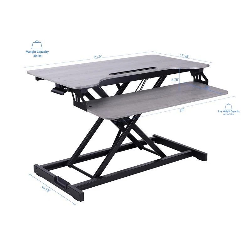 With its spacious 31.5" W x 16.4" D work surface, you can hold up to 2 large monitors, a laptop, and more. It also includes an extra large keyboard tray that measures 30" W x 10" D that is an ergonomic 4" below the desktop. EVR Enhanced Vertical Range rises up to 19.7" and down to 4.3", to optimize the ergonomic work position for people of all heights. Straight up and down motion minimizes required depth (17"). Gas piston assist allows you to easily raise and lower up to 30lbs. Grommet hole allows you to route cables or add an optional single or dual monitor arm. Fully assembled and ready to go! Our product comes with a MANUFACTURER LIMITED 1 YEAR WARRANTY as well as a customer service and tech support team that is always ready to help. The Height Adjustable Sit to Standing Desk Riser and Converter offers the versatility you need to get through your work day. It fits over your current desk with no need to buy additional furniture.