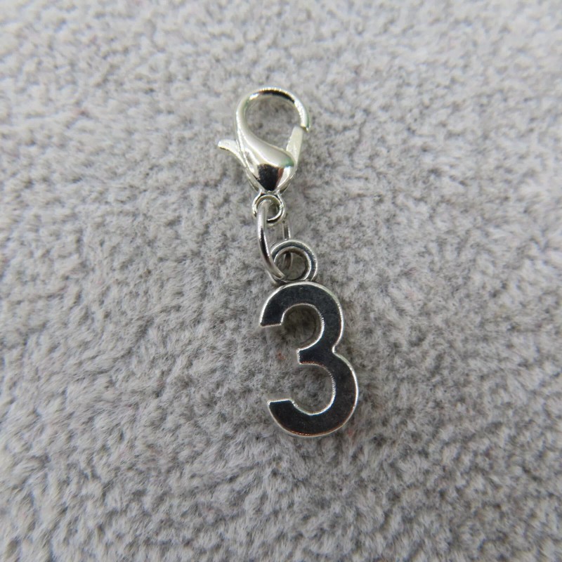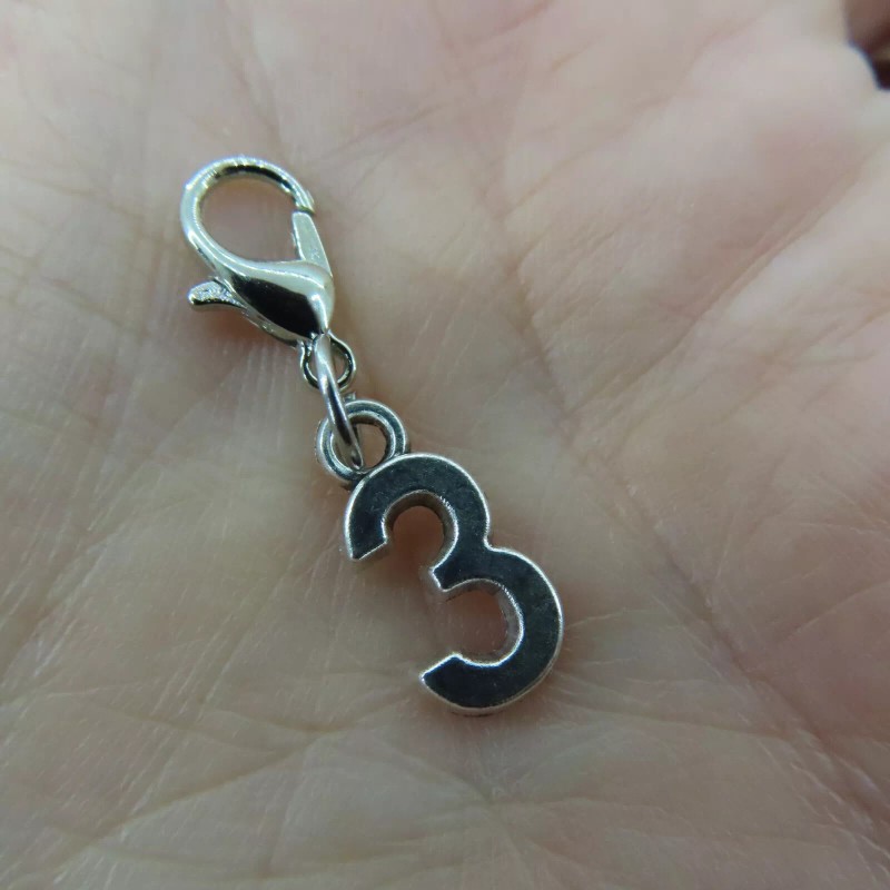 Pemby Studio Initial NUMBER 3 Three Charm Zipper Pull Keychain Add On Clip Silver Tone Team