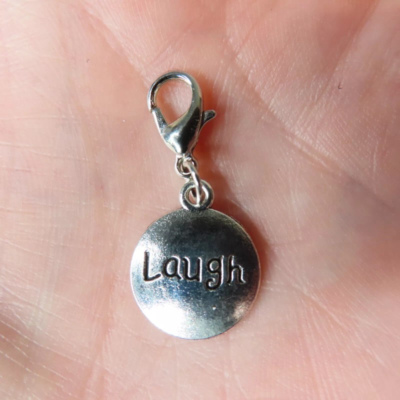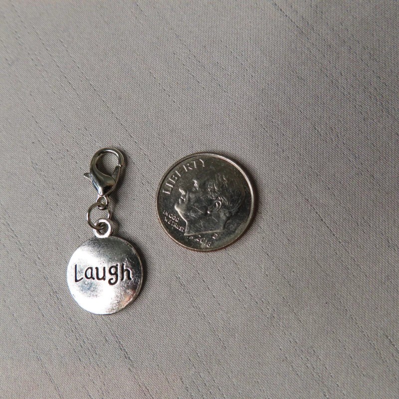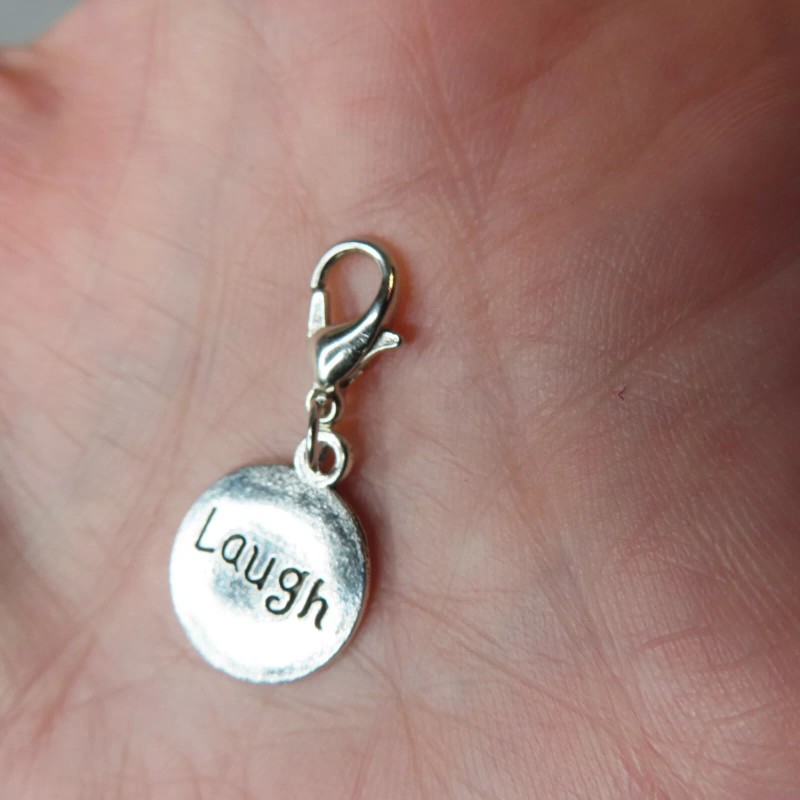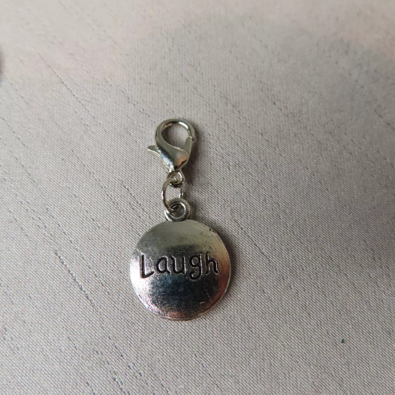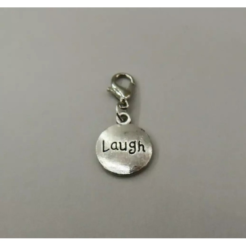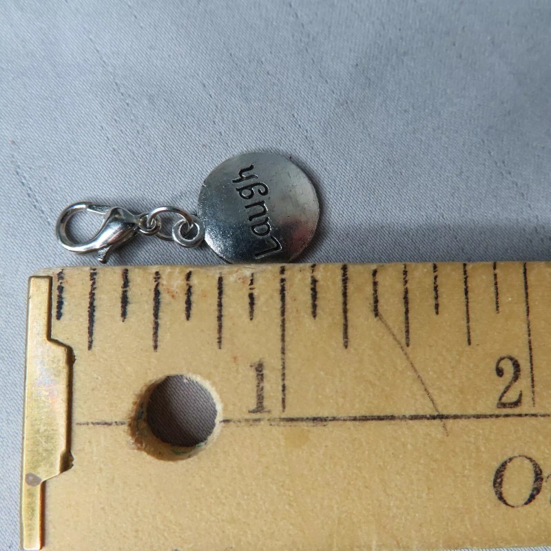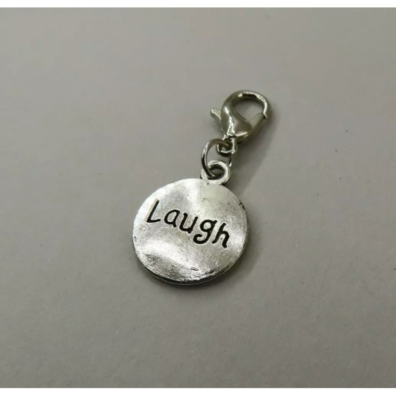 Pemby Studio LAUGH Charm Zipper Pull Keychain Add On Clip Silver Tone Double Sided Dangle NEW