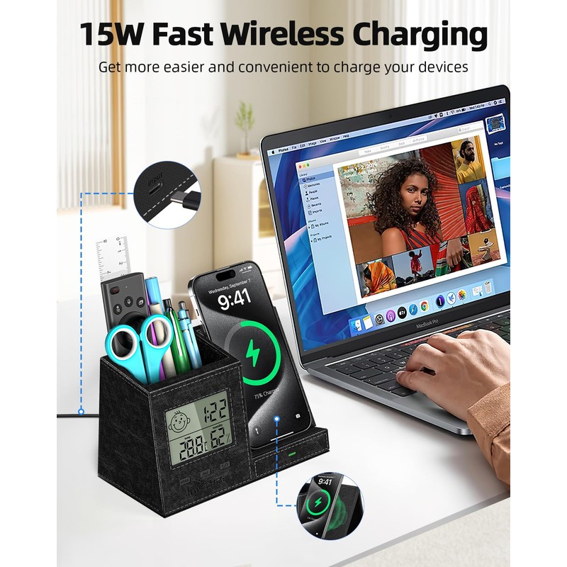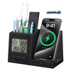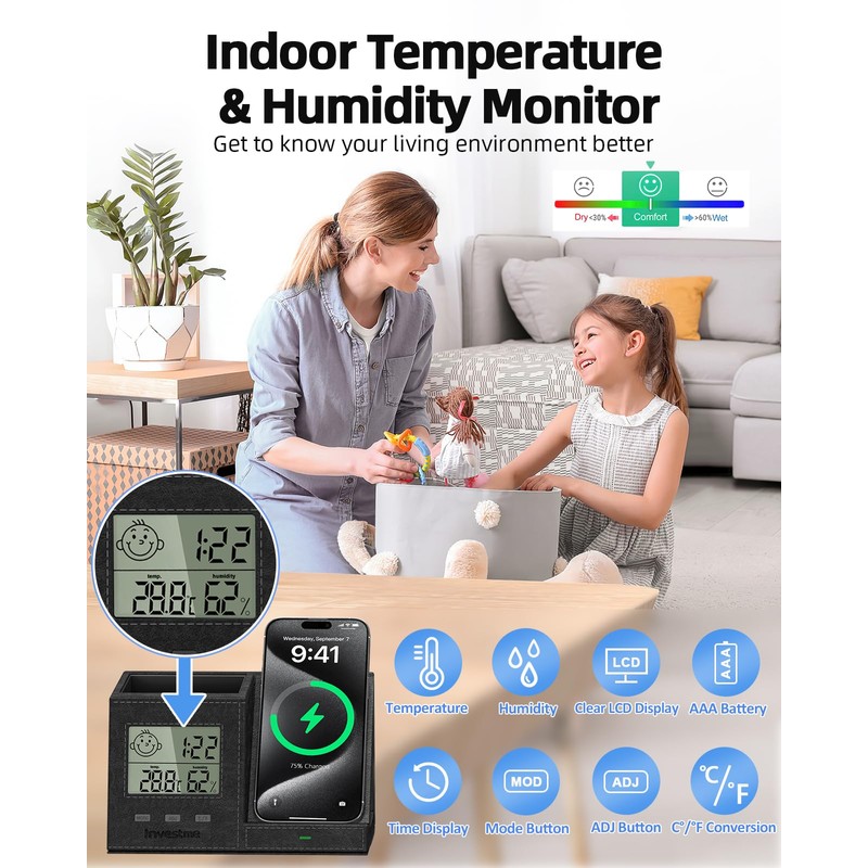 - 【4 in-1 Multi-functional desk organizer】 This desk organizer combines Wireless Charging Station, Pen holder, Clock, Digital indoor thermometer and Humidity monitor into one. One piece to meet your various needs.