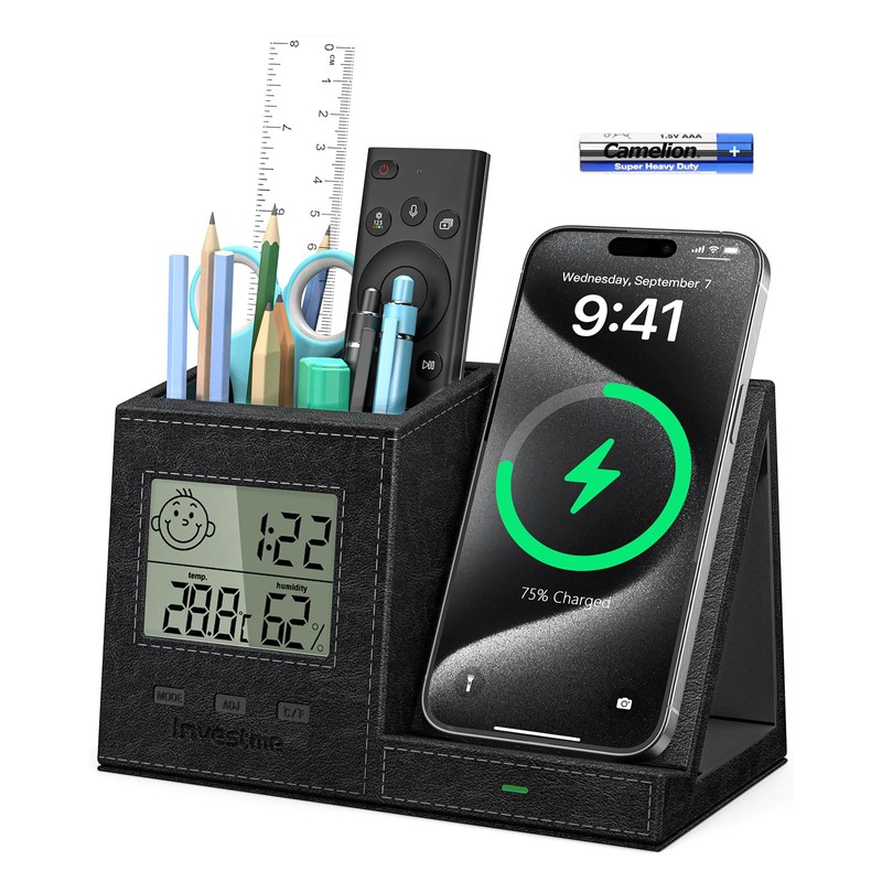 - 【Stylish and Functional】This pen holder for desk is designed to wireless charged your cell phone, keeping your pens, pencils, remote control, and other daily-used small things close at hand and get to know your living environment better through the digital hygrometer thermometer. Great for dressers, nightstands,desk and table-tops. Use in living room, sturdy room, bedroom, classrooms, restaurants, hotels, home and office.