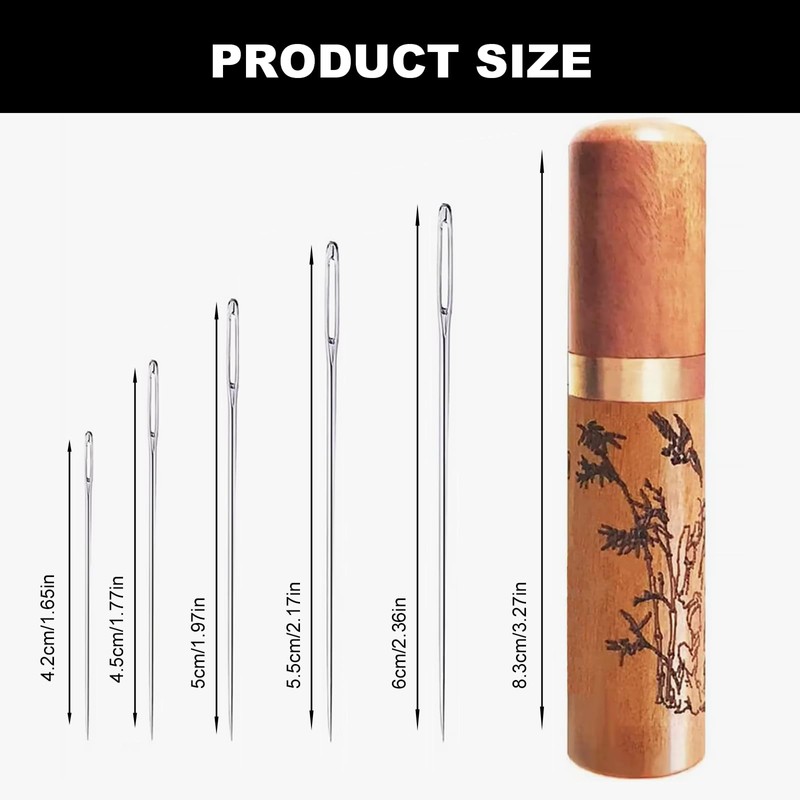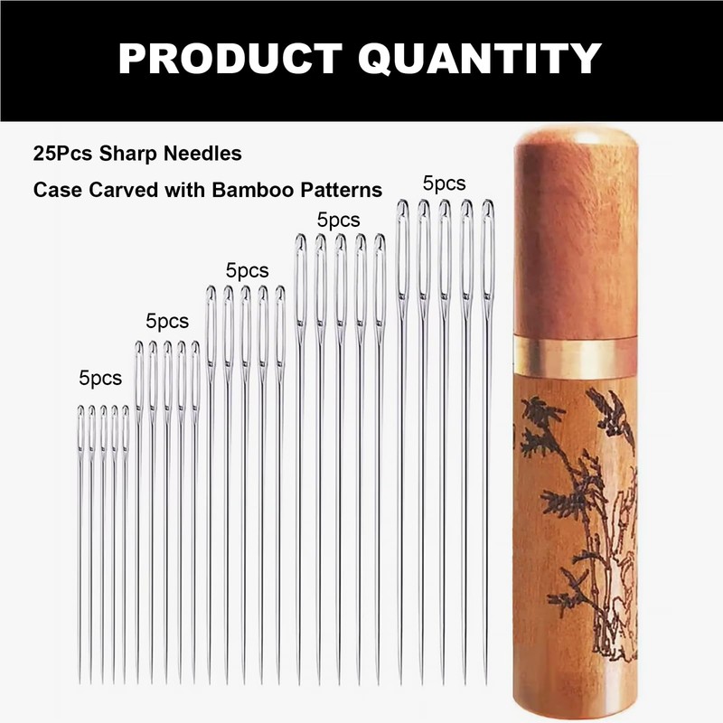 - 【Premium Package】Get 25 large-eye stainless steel sewing needles in 5 sizes + 1 hand-carved sandalwood & brass needle case – perfect for embroidery, stitching, and all hand-sewing needs.