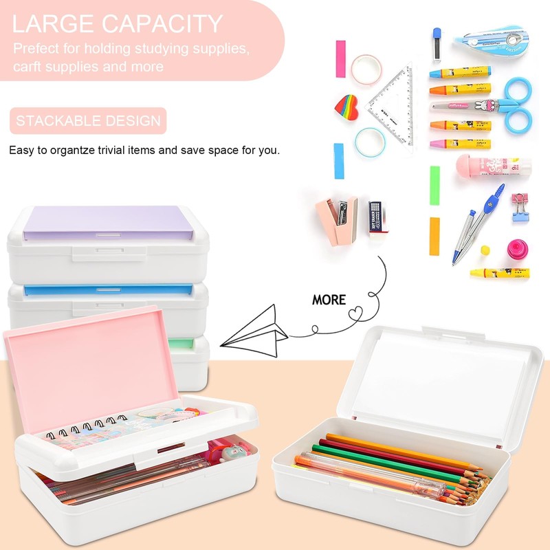 • AMAZING DESIGN: The pencil cases features a two-tone design with a brightly colored lid to show off your personality and an opaque white bottom layer to protect privacy. The plastic pencil box features a snap closure on the lid, easy to open and close, can effectively prevent the items losing. There are convex slots at the bottom of the box, allows you to stack multiple cases conveniently together.