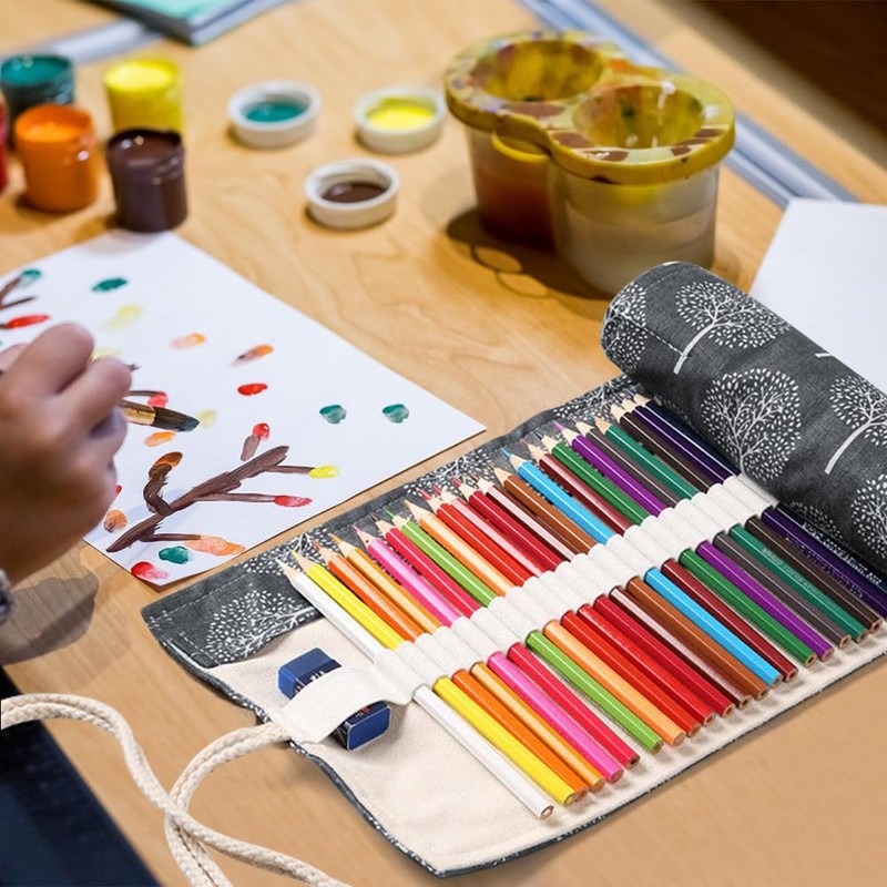 - The pencil wrap has 36 slots that can hold different types of pens such as coloured pencils, gel pens, brushes, watercolour pencils, etc. It has an elastic pen ring and a cover to prevent the pen tip from falling off.