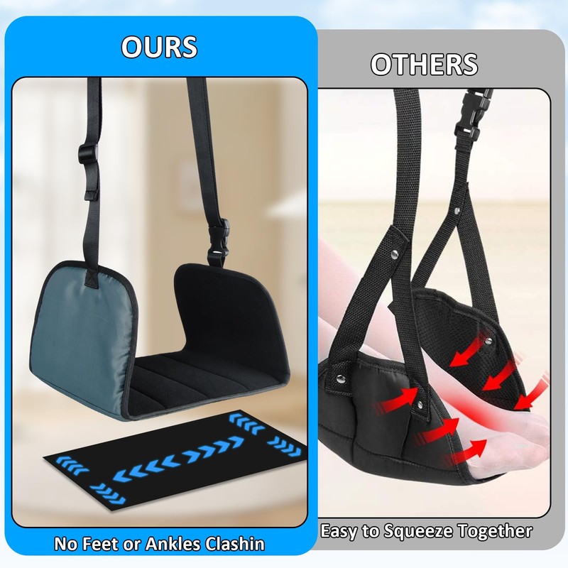- Airplane foot hammock: Adjustable straps make it ideal for all ages and heights. 13.3 inches to 33.4 inches for everyone. Simply hang the airplane leg rest on the tray table in front of you, adjust the straps and enjoy a smooth flight.