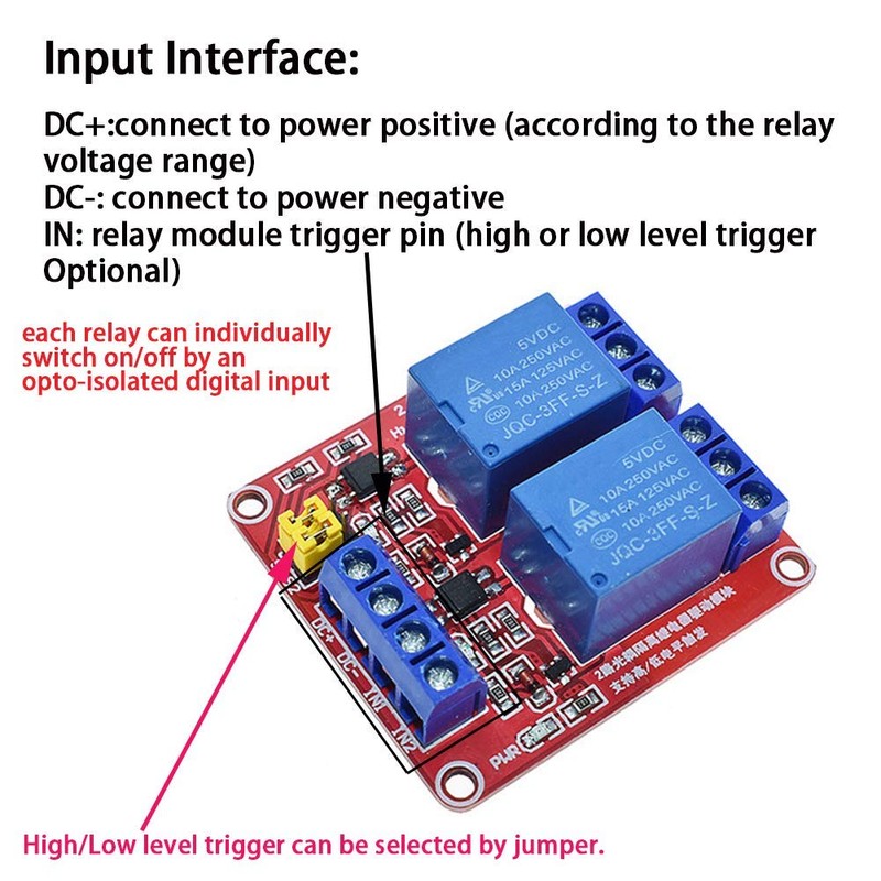- High/low level trigger can be selected by jumper. Very versatile, you can reverse the input logic with the jumper.