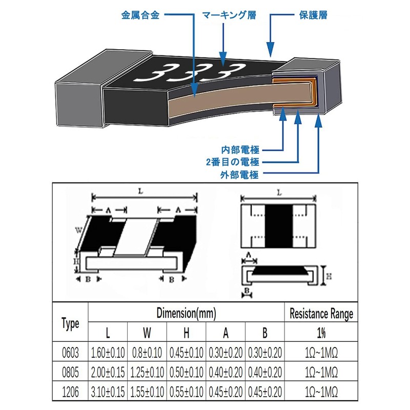 - This chip resistor uses a metal-based glaze thick membrane to provide excellent heat and weather resistance