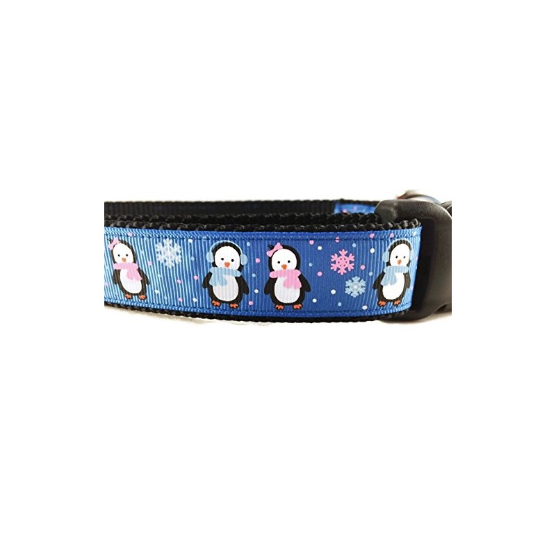 Penguin Dog Collar, Caninedesign, Christmas, Blue, 1 inch Wide, Adjustable, Nylon, Medium and Large (Blue Penguins, Large 15-22")
