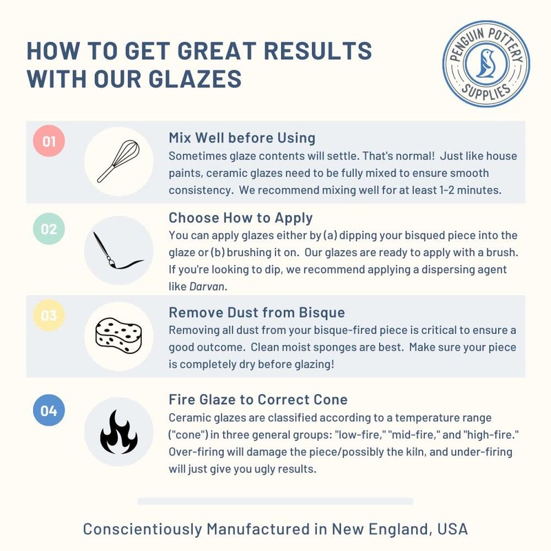 - Our glazes made in the USA by expert potters. They are lead-free, non-toxic and food safe (when properly fired and tested). Our mid fire glazes offer similar color ranges to our low fire glazes, but also introduce interesting effects and tonality not available in low fire glazes when fired in a pottery kiln at cone 5 or cone 6. Sometimes glaze contents will settle. That's normal! Ceramic glazes need to be fully mixed to ensure smooth application. We recommend mixing for at least 1-2 minutes.