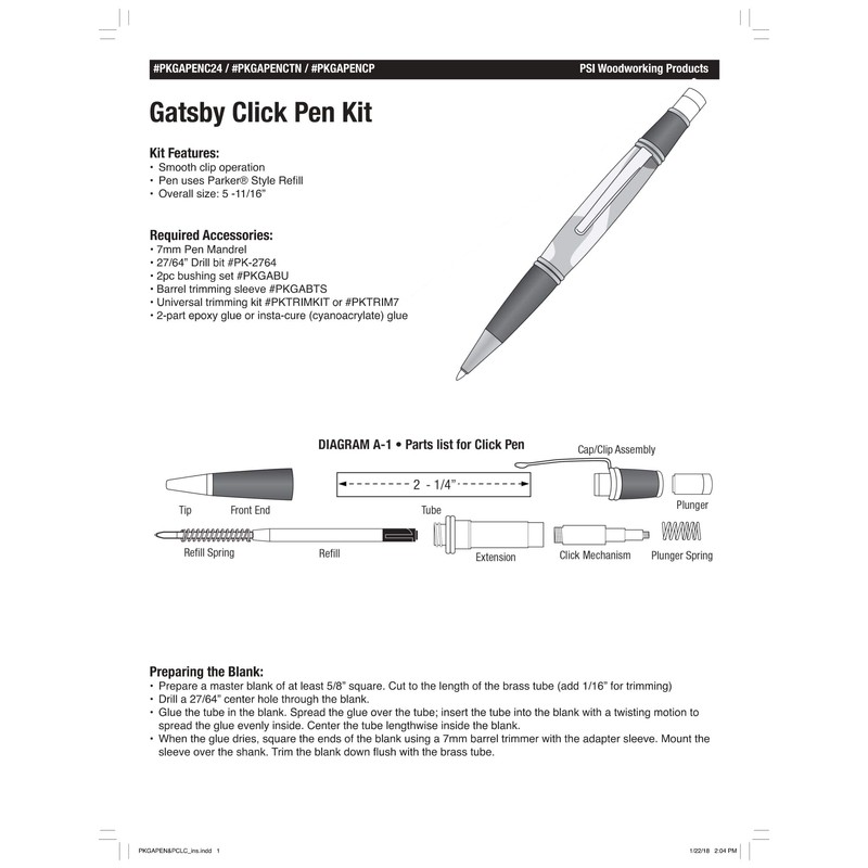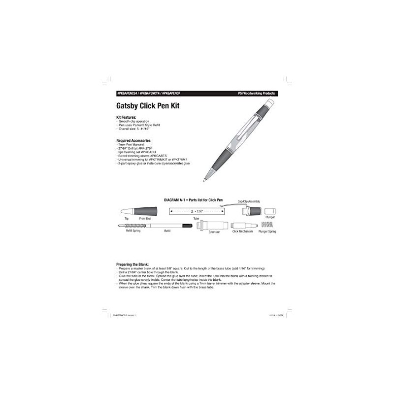 - "Click" version of our popular Gatsby Pen Kit. Ideal for those of you who prefer to "click". Uses the same turning accessories as our "twist" version. Exhibits mystery, flair, and elegance. Streamlined look and striking components.