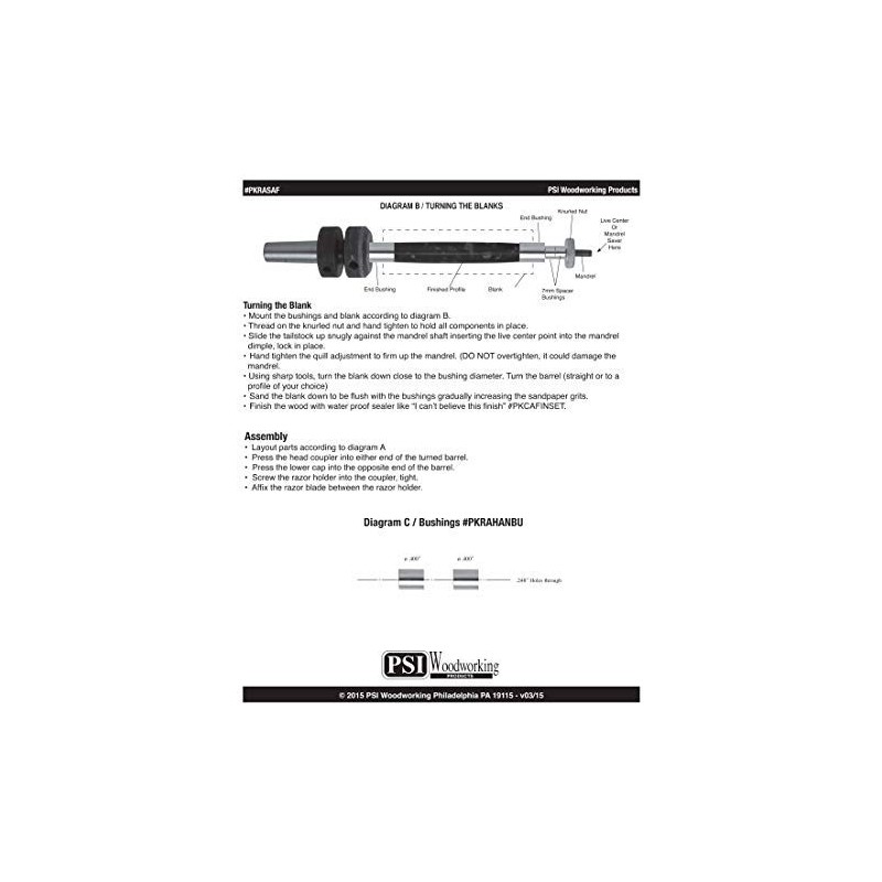This is a woodturning project kit; Hardware razor parts only; A LATHE IS NEEDED TO 'TURN' INTO FINISHED SAFETY RAZOR; Blanks, bushing set, drill bit and all other turning tools and supplies are not included. Includes (1) PKRASAF Chrome Safety Razor Handle Kit; Blades are not included. Each double-edged safety razor woodturning kit includes (1) handle brass tube, (2) fittings, and (1) razor head with standard m5.x .8 thread. Uses bushing set PKRAHANBU; Minimum blank size needed to turn is 3/4" x 3/4" x 3-1/2". Features a 7mm tube design.