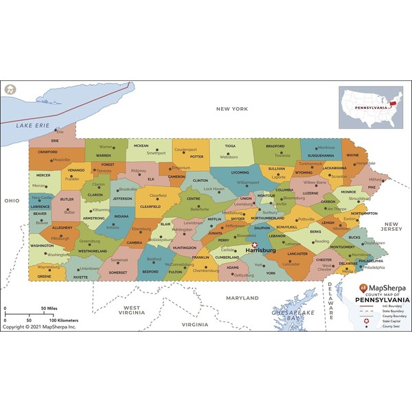 This map has been created exclusively for MapSherpa, and designed for reference or business use. Clear and clean colors & fonts matched with cartographic research makes this map of Pennsylvania Counties Map easily readable and useful. The map shows the 67 counties of Pennsylvania and their borders across the Keystone State.