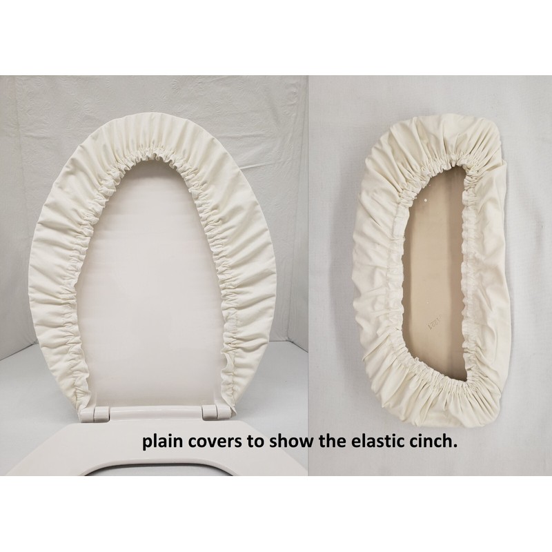One size fit most oval and round standard home toilet lids. Elastic cinch around the edge allows for a secure fit underneath the lid/tank. PICTURED IS THE SAME COVER ON BOTH TYPES OF LIDS.