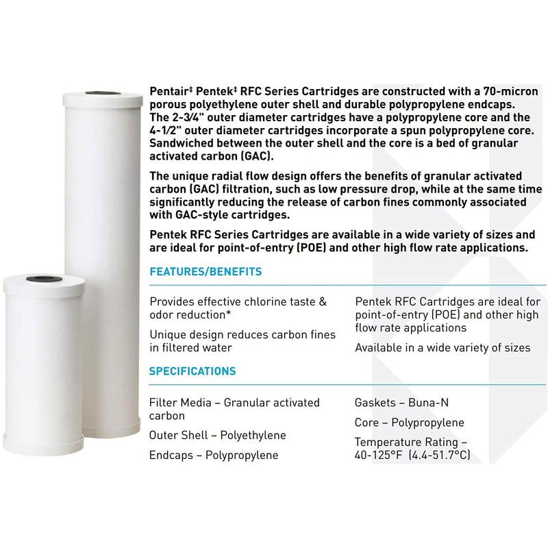 The Pentek RFC20-BB carbon filter cartridge is designed to reduce chlorine, taste and odor in residential drinking water. In addition to chemical reduction the radial flow technology provides superior flow at low pressure drop suitable for applications requiring high flow such as Point of Entry (whole home) that supply multiple water using appliances. This cartridge also includes a 25 micron rating of which provides basic sediment reduction. This cartridge meets National Sanitation Foundation/American National Standards Institute (NSF/ANSI) standard 42 for material requirements only. Do not use with water that is microbiologically unsafe or of unknown quality without adequate disinfection before or after the system.Designed for most residential drinking water applications. Pentair water filters are manufactured in the form of replaceable cartridges that fit inside housings designed to perform as a filtration system. Filtration systems can consist of a single stage or multiple stages, using one, two or more types of filter cartridges to reduce multiple contaminants. The performance of filter cartridge is measured by the minimum particle size that is blocked and the type of unwanted contaminants it is designed to reduce. Additional performance factors include the maximum flow rate, and the capacity or amount of water that can be filtered before the filter must be replaced. Water cartridge filters are used in a wide range of drinking water applications including Point of Entry (whole home) installations and Point of Use (undersink applications). Pentair manufactures residential, industrial, and commercial water filtration components and systems. The company, founded in 1966 and headquartered in Minneapolis, MN