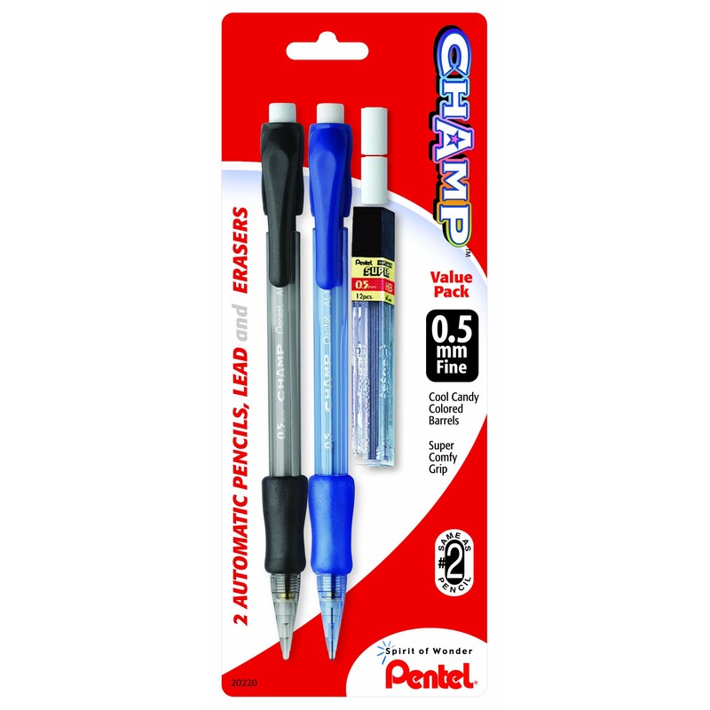 Pentel Champ Automatic Pencil with Lead and 2 Erasers, 0.5mm, Assorted Barrels, 2 Pack (AL15LEBP2)