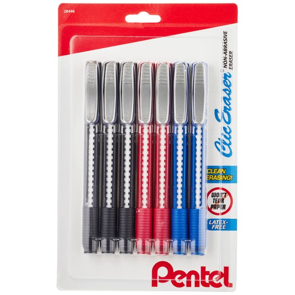 Pentel Clic Eraser Grip Retractable Eraser with Grip Office Barrel Colors (Black, Red, Blue) 7 Pack
