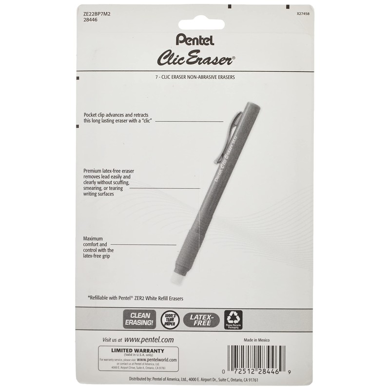 - Pocket clip advances/retracts this long lasting eraser with a "clic"