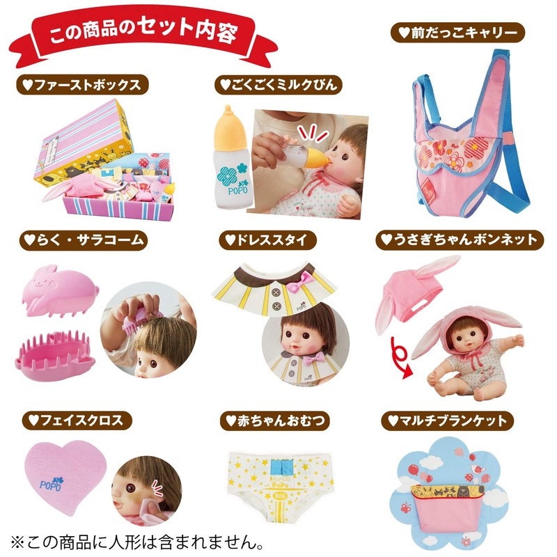 - Set Includes: First Box, Front Carrier, Rabbit Hood, Raku Saracom, Multi Blanket, Dress Tie, Super Milk Bottle, Baby Diaper, Face Cloth