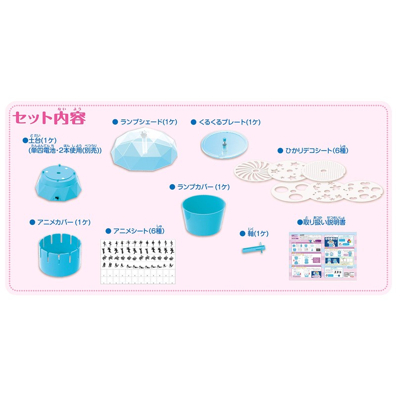 - Set Includes: Base, lamp shade, curl plate, Anime cover light, lamp cover, anime sheet (6 types), Hikari Deco sheet (6 types), shaft, instruction manual (English language not guaranteed).