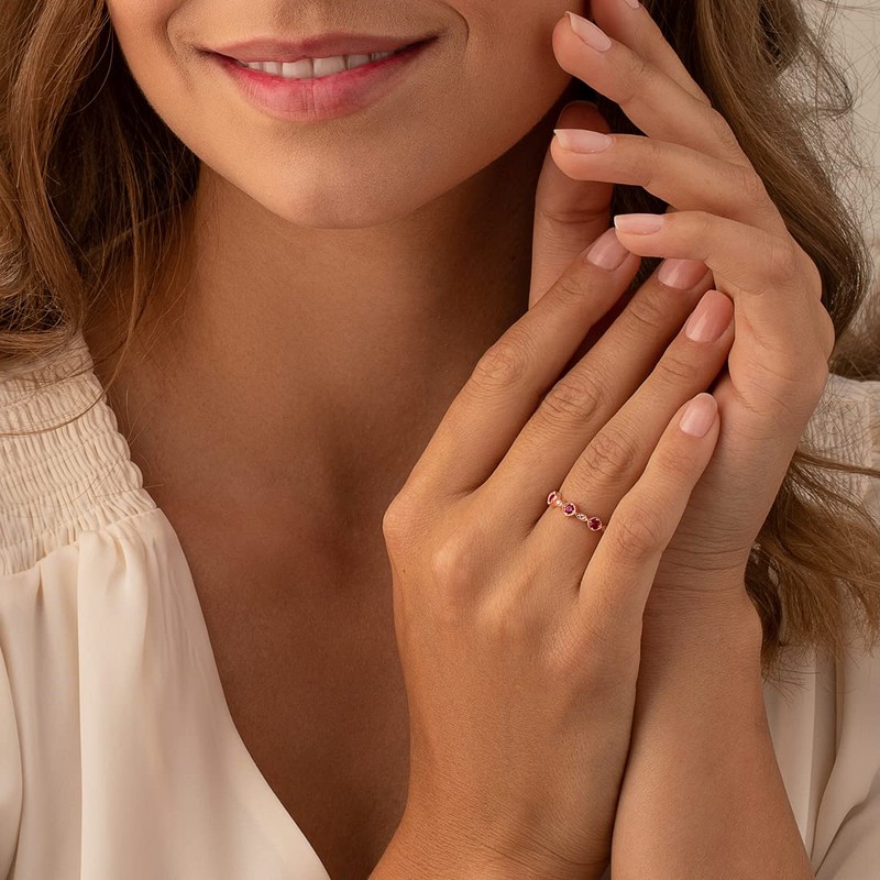 - SIMPLE YET ELEGANT - Milgrain stackable ring featuring Peora Created Ruby stones with vibrant Pigeon Blood Red hue, 2.5mm, 0.24 carat total. Alternating round and marquise pattern design adds elegance without overwhelming the piece. Embellished with machine cut Cubic Zirconia elevates this rose toned Sterling Silver stackable ring in Sterling Silver. Ring band is 2mm in width which makes it easy to wear as solo or layered stacked with your favorite rings.