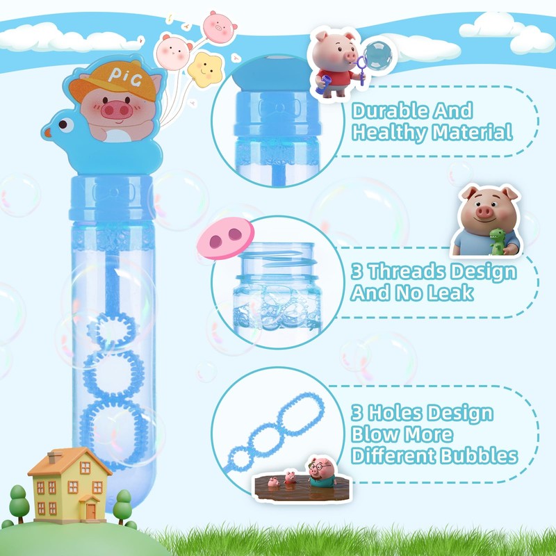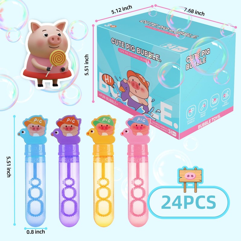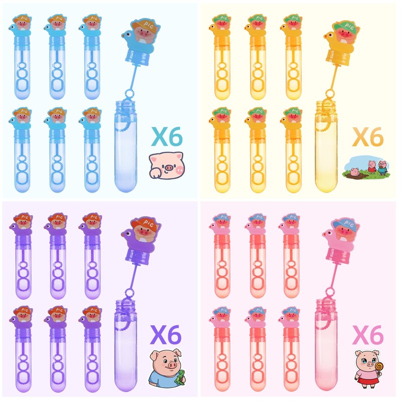 - CUTE PIG DESIGN:24 pcs Bubble Wands contain 4 colors of Cute Pigs, 3+ years old kids will have a clear understanding to the Role of Pepa. Kawaii Pigs blow out tons of colorful bubbles, Piggy-themed birthday party will impress your kids in the Bubble world and host a magical and memorable birthday party with all your friends!