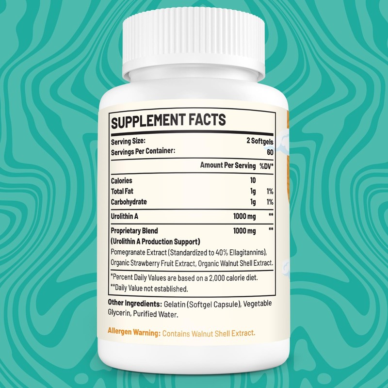 Our high-potency Urolithin A supplement. Each bottle contains 120 easy-to-swallow softgels, delivering a powerful 2000MG per serving.