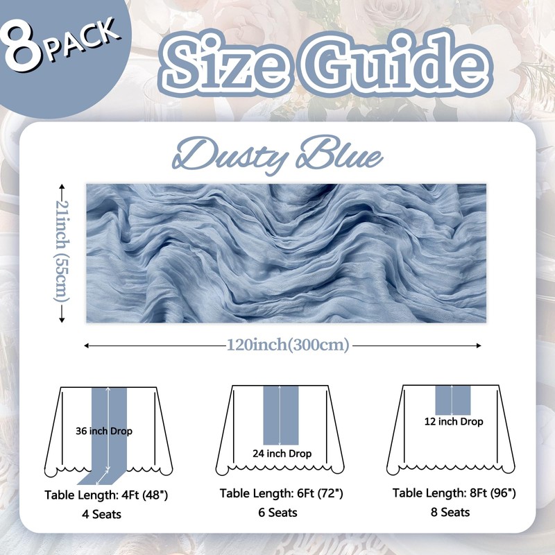 - 【Package Included】You Will Be Delighted To Receive 8 Packs Of Dusty Blue Table Runner. The Dusty Blue Cheesecloth Table Runner Quantity Is Abundant, Fully Meeting Your Daily Use And Various Event Needs. The Size Of The Table Runners Is 21 x 120 Inch, Which Can Perfectly Fit Tables Or Chairs In Various Event Scenarios. Besides, We Have Carefully Prepared A Wide Range Of Color Options For You, Which Are Highly Suitable For Creating A Romantic And Extraordinary Atmosphere.