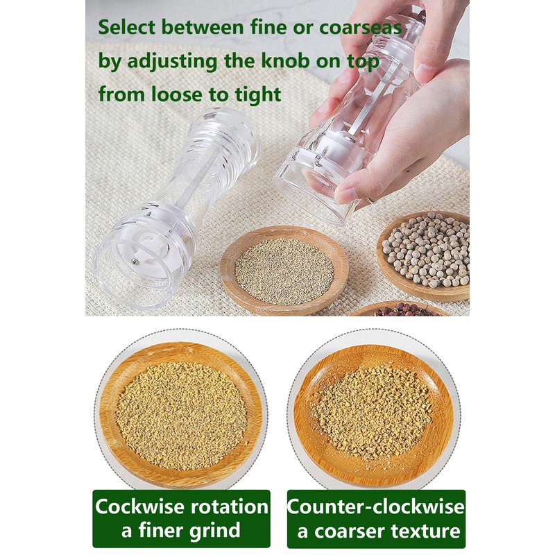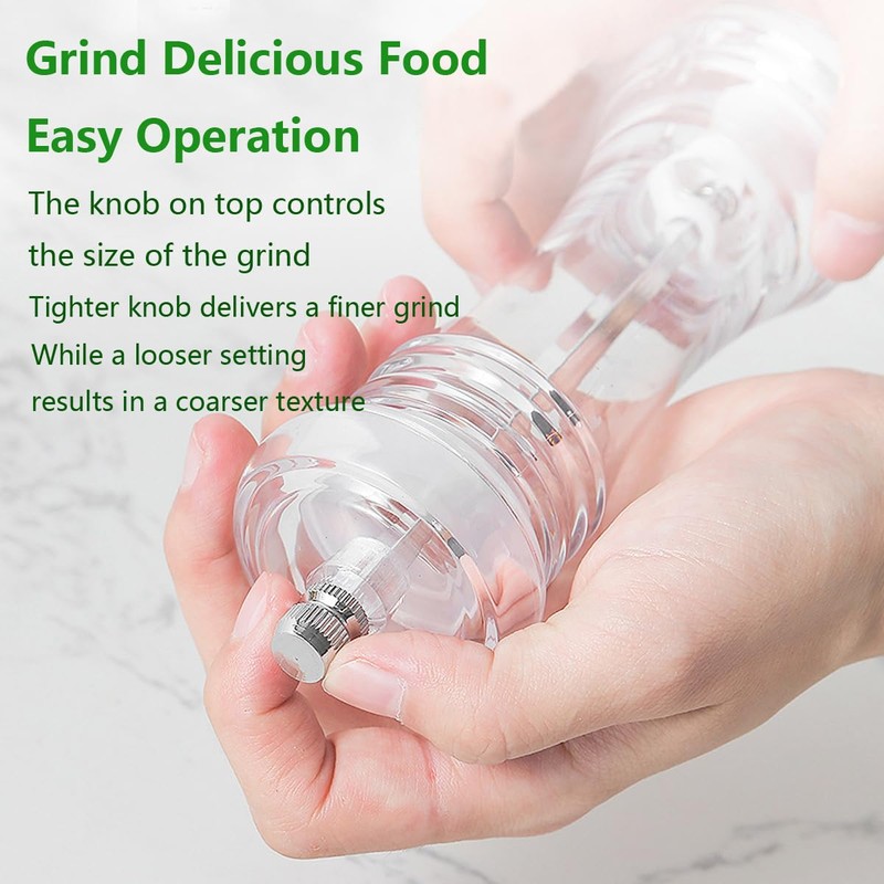 • [Transparent Acrylic Body],The body of the pepper grinder is made of high-quality transparent acrylic materials,Integrated polishing, smooth and rounded,easy to grip and grinding,it looks very neat and classy, allows you to identify spices at a glance by its easy-to-see body,you will never miss the best time to refill the spices. meanwhile simply remove the nut and lid, refill with your pepper from the top.(The Acrylic Body has an injection molding port, which is not a defect)