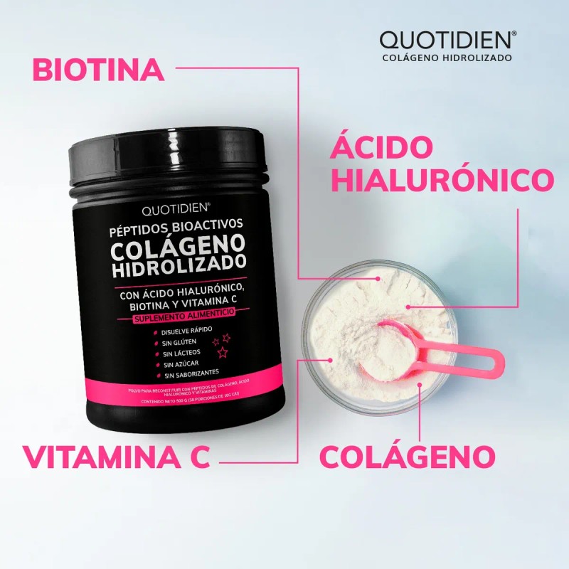 Peptidos Bioactivos De Colageno Hidrolizado Quotidien Essential Moments Con Ácido Hialurónico, Vitamina E, Biotina Y Vitamina C - Colageno para Piel y Uñas - 50 Porciones
