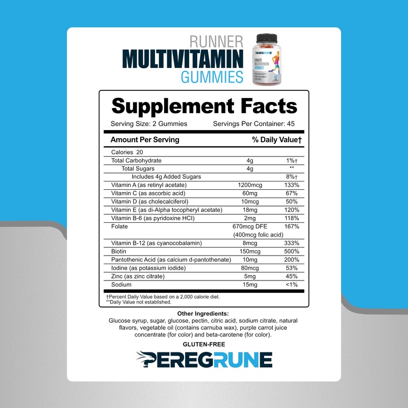PEREGRUNE Runner Multivitamin Gummies - Daily Vitamin for Running with Vitamins A, C, D, E, and B Complex – 50% Less Sugar – Antioxidants, Recovery, Endurance, and Energy Gummy – Certified Running Sup