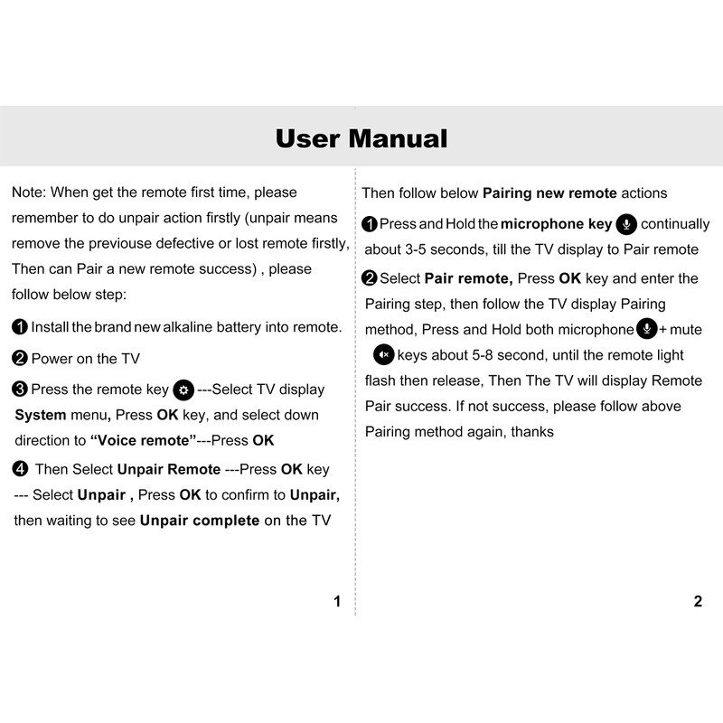 - NOTE:When Get the remote first time, please remember to do unpair action firstly, please follow below step: 1.Install the brand new alkaline battery. 2.Power on the TV 3.Press the remote Setting key--system , Press OK key, and select down direction to “Voice remote”—Press OK Then Select Unpair Remote ---Press OK key--- Select Unpair , Press OK to confirm to Unpair, then waiting to see Unpair complete