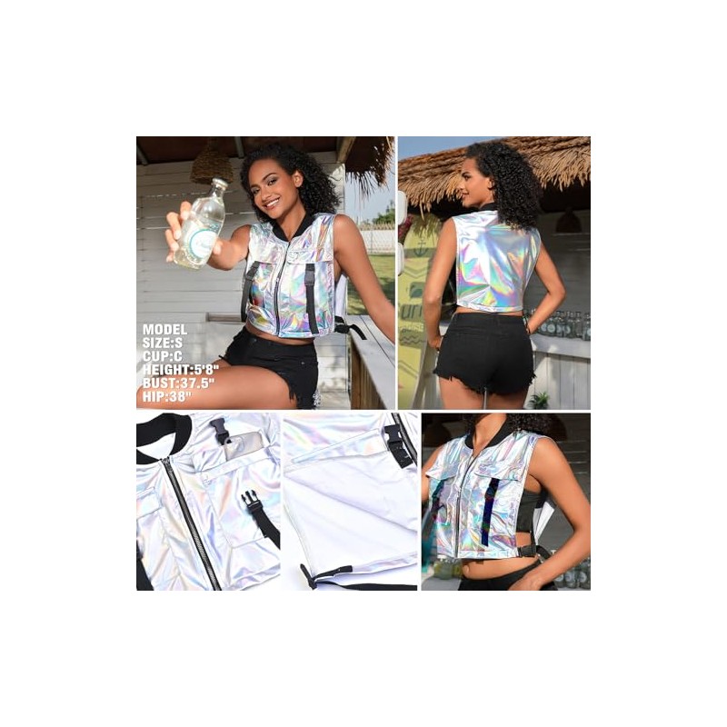 Perfashion Women Cropped Vest Streetwear Cyberpunk Jacket Adjustable Buckle Metallic Tops Club Clothes Silver L