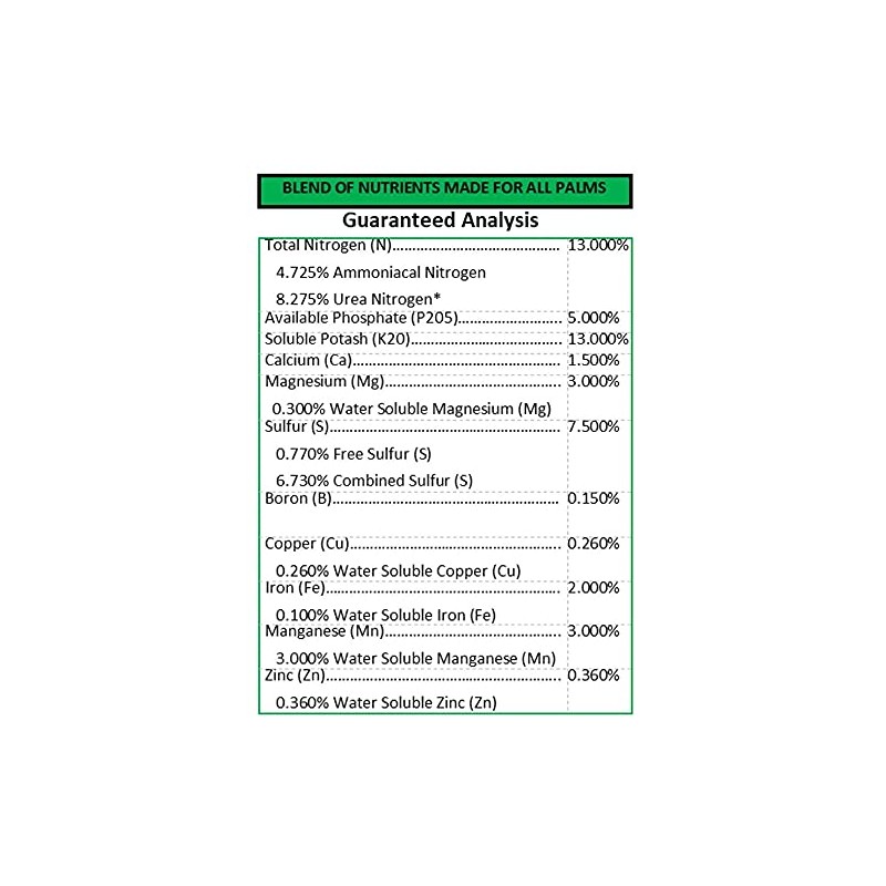 - Highest Levels Of Nutrients Available For Palms Including Macro and Essential Micro Nutrients like Boron and Manganese. DUAL ACTION ingredients for Magnesium and Iron uptake in all Ph Soil Types