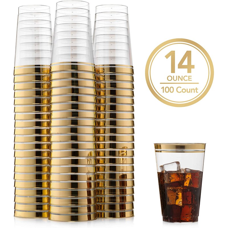 - ELEGANT APPEARANCE - The elegant metallic gold trim around our plastic cups add a stylish feel to any event. This value pack of 100 is a perfect package, especially since it easily holds a standard can of soft drink or soda.