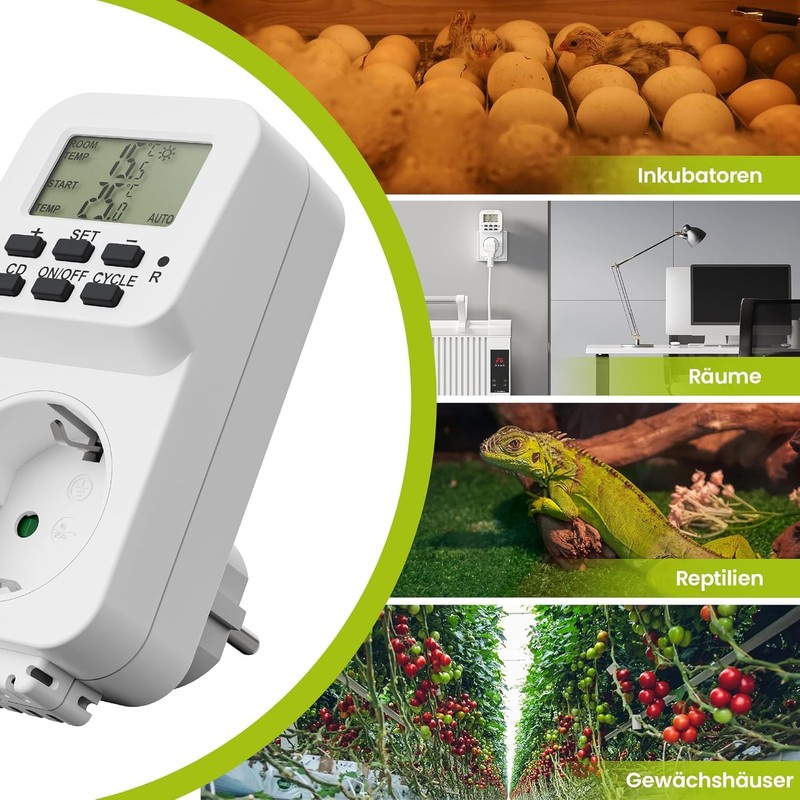 - Countless applications: whether for your infrared heater, electric heater, mobile air conditioning, cool box or frost monitor. Rely on our socket thermostat solution to ensure precise temperature control for your plants and animals.