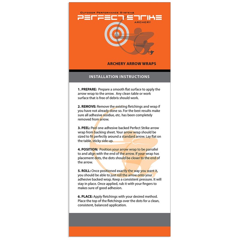 A better quality arrow wrap! We are proud to offer these high visibility, durable, premium vinyl arrow wraps. Perfect Strike arrow wraps have been created with perfection in mind. Crafted for skills development and personal discovery, these arrow wraps are part of the Perfect Strike product line. The targets have been developed by technical archers of all skill levels. While Outdoor Performance Systems products are inspired by people and places from around the globe, all creative design, product development and manufacturing take place here in the USA.