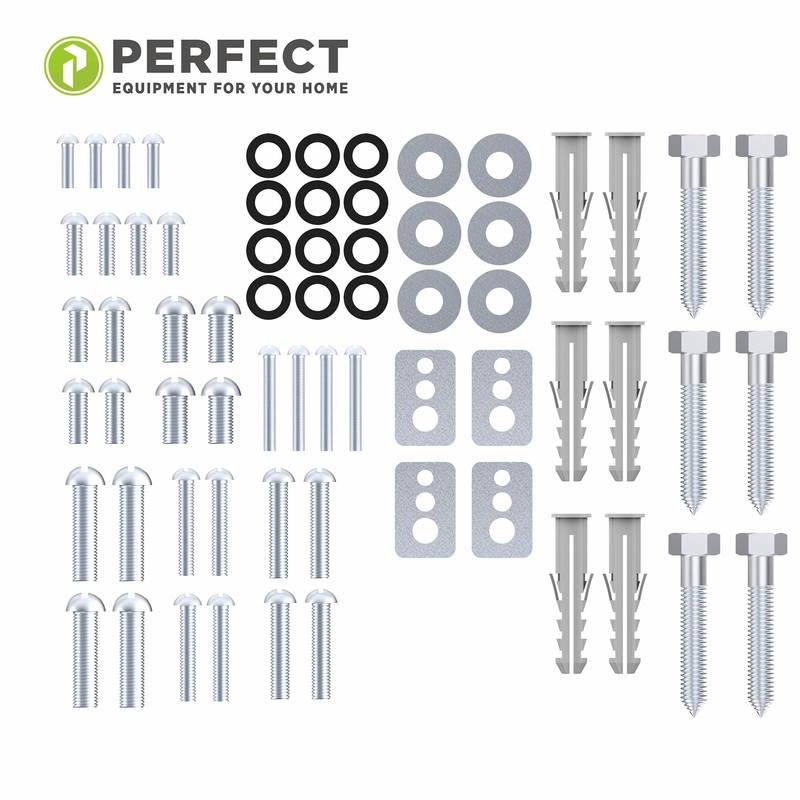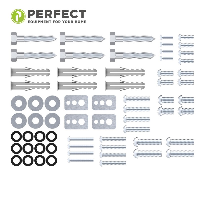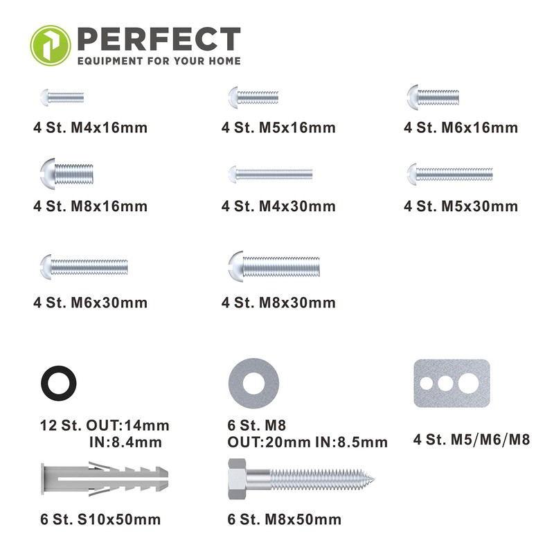 - Box contents: 32 x Perfect TV screws, 6 x wall plugs + wall screws, 6 x washers, 4 x washers, 4 x washers, 12 x spacers.